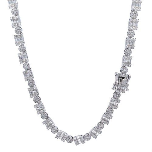 GLINT; This Rhodium Moissanite Iced Out Chain exudes luxury and elegance, perfect for making a bold fashion statement. Its rhodium coating ensures a brilliant, tarnish-resistant shine, while CZ stones provide unmatched sparkle and durability. This chain complements both casual and formal attire, adding a touch of sophistication to any outfit. Ideal for those who appreciate fine jewelry, it offers a stunning alternative to traditional diamonds.