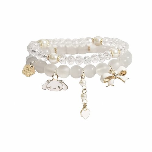 This elegant 3-piece bracelet set features white and clear beads with gold-tone accents and cute dangling charms including a cartoon puppy, bow, heart, and flower. Made with elastic stretch for a secure and comfortable fit, these bracelets are perfect for girls, teens, or fans of kawaii fashion. Ideal for casual wear, gifting, or themed outfits.